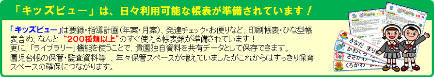キッズビューは、今まで手書きで作成していた書類をパソコンで管理し、園全体で共有情報として有効活用します。 入園から卒園まで、子ども一人ひとりの成長の経過と指導の過程を確実に把握できます。 また、個人情報の取扱いについても、万全の対策が施され安心してご利用いただけます。 |