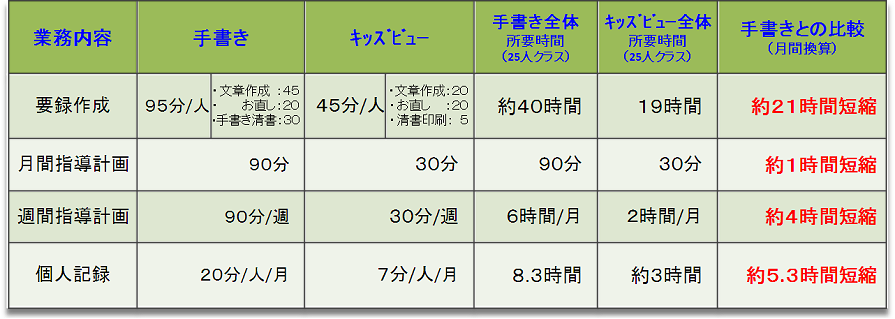手書きでは、この他日々の記録の収集や、出席日数の集計・前回内容との比較作業・園ノウハウの都度伝達・作成した要録の添削・修正等、目に見えない様々な時間を要しているのが実状です。